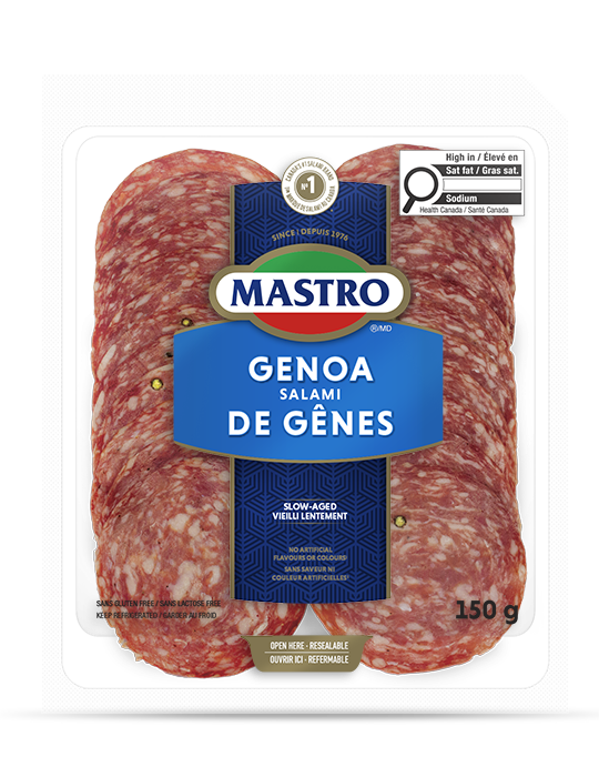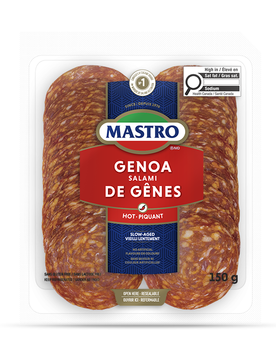One of the best known Italian salamis, Mastro® Genoa Salami is dry cured with a mild yet full aroma, punctuated by delicious spices. Savoury, rich, bold and Spicy, Mastro® Genoa Salami is made with only the best grades of choice lean pork and enhanced with a unique blend of seasonings. This delightfully robust salami is carefully prepared and slowly aged to achieve a traditional old-country flavour and aroma. Our timeless recipe cuts no corners in its homage to Italian tradition. Also available in Mild and Hot.